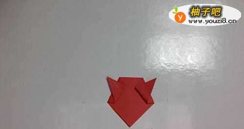4如图翻过来。折嘴的部分,先上折。再把小角向内折适当部分。