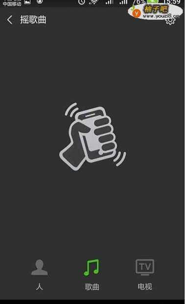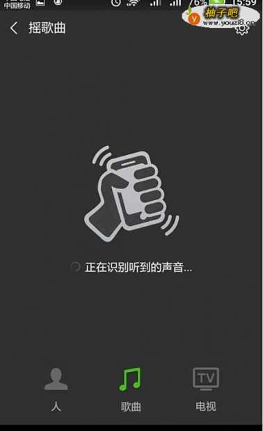 2二、进入摇一摇之后,下方有三个选项,“人”、“音乐”、“电视”,我们选择“音乐”,然后开始左右晃动手机两下,然后系统开始识别听到的声音,识别完成后我们就可以看到系统给出的音乐名子,及目前你听到的音乐播放进度。