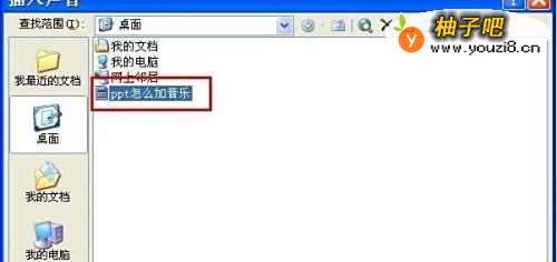 3在插入音乐窗口中找到需要添加的音乐文件,选择后确定。