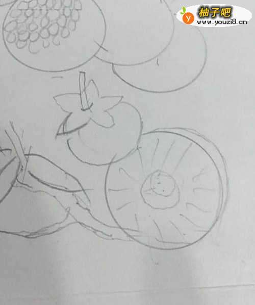 5第五步 再画上一点杨梅树枝子 和叶子 然后再画上切过的半个杨梅