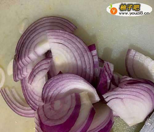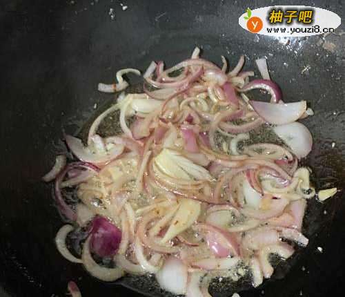 7将多余的食用油倒出,留少量;将洋葱下入锅里炒香
