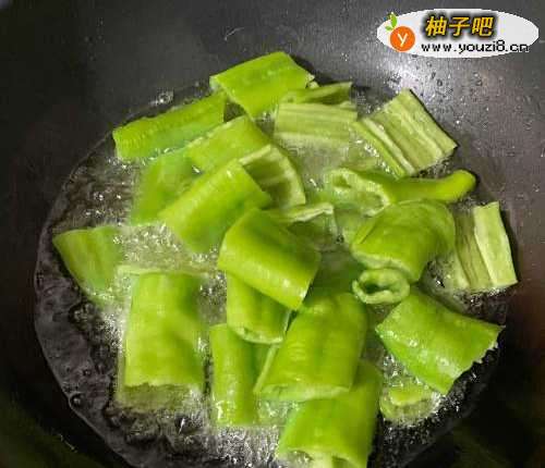 4锅里加入较多的油,烧热,将青椒入锅里炸3-5分钟