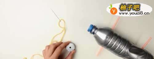 7在瓶盖中间钻一个洞。在绳子上打个结,然后把绳子穿进瓶盖,注意结一定要在瓶盖内侧,最后把瓶盖拧好。