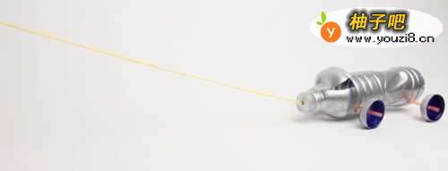 6将车轴穿过瓶身。车轴可以是两根或四根,看你选什么材料。长的车轴就直接从瓶身一边穿到另一边;短的车轴,比如牙签之类的,就每个孔都穿一根。