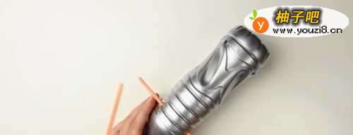 2在瓶身两侧分别扎两个孔。车轴要从孔中间穿过去,所以对应的孔之间应该齐平。