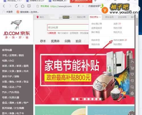 2将鼠标移动到我的京东标签上打开下拉折叠菜单,选择"我的优惠券"。如图所示: