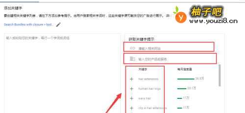 5可以在获取关键字提示中输入相关网站和产品服务,可以选择提示的关键字,点击关键字前面的“+”号,即可添加为自己的关键字