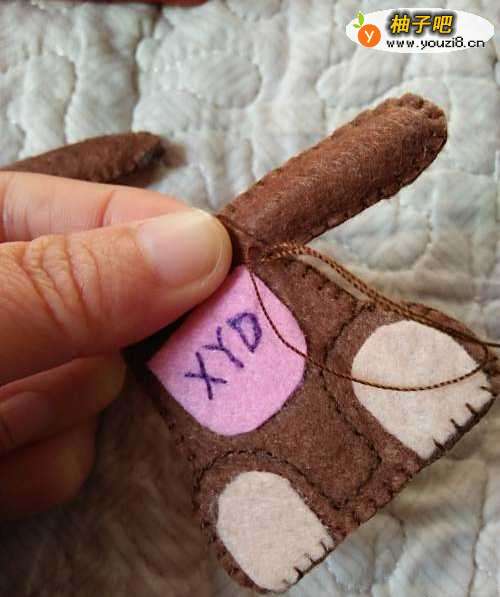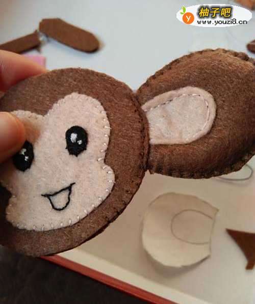 6接着我们把另一片脑袋的不织布和前边的缝合在一起,从小猴的脖子开始起针,在缝耳朵的时候我们用的是回针针法,缝到头顶的时候,我们剪一小长条用来做挂绳,一起缝上就可以了。