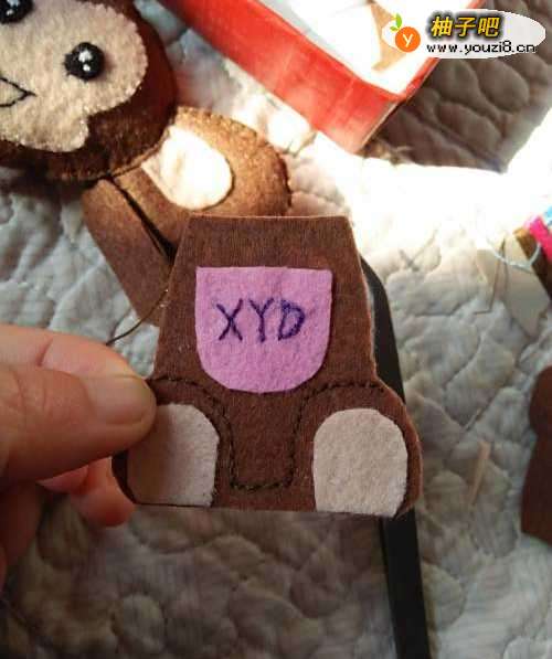 9中间的字母我们可以写上自己喜欢的人的名字。然后把两片身体用锁边针法缝合在一起,接着下面我们开始做小猴的手臂,里边也要塞入丝绵。
