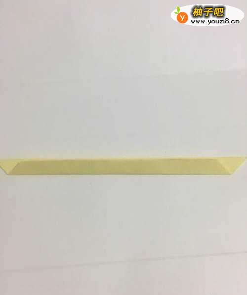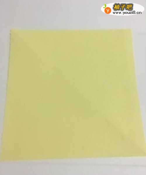 第一步 把一张16厘米x 16厘米的正方形黄色彩纸 从下向上对角折叠
