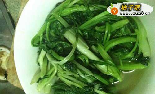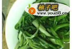 3锅中放入少量油,烧开后将菜苗放入,赶快翻炒,约1分钟,变色后加少量盐,少量鸡精。
