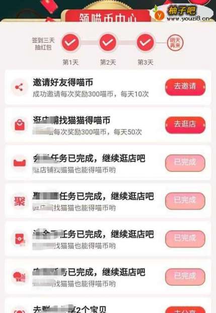 3第二种方法就是点右下角的领喵币,然后就会看到一些任务,每次完成相应的任务都可以获取喵币