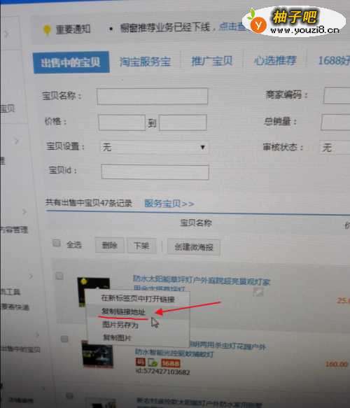 7鼠标右键点要发布到微博橱窗宝贝的图标。弹出的页面左键复制宝贝的链接地址。