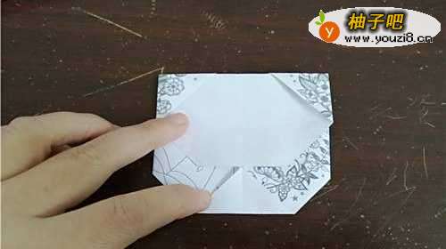 3把上面的角向后折,然后把彩纸翻到背面,如图。