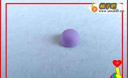3再取蓝紫色彩泥适量,滚搓成小圆球,再捏制成半圆球的形状,作为“帽顶”。