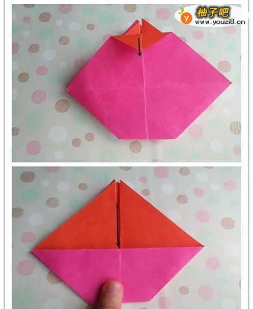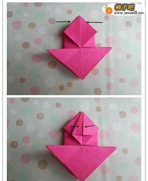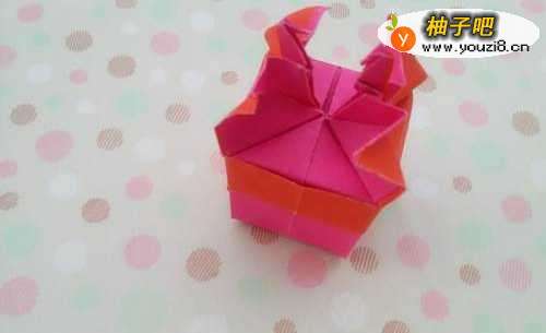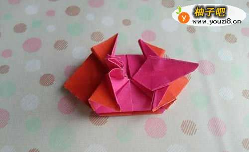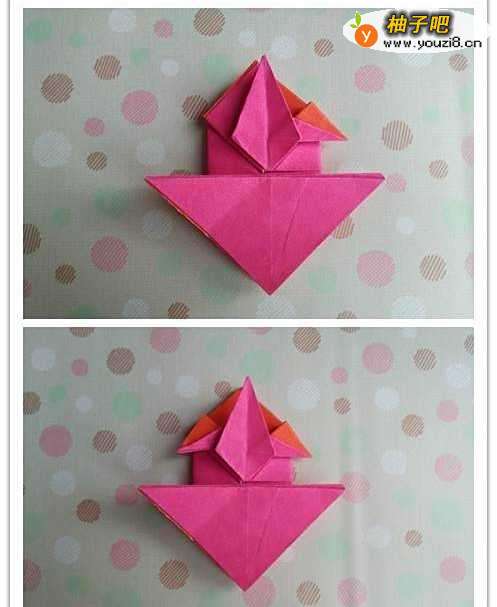 8旋转90°后将左边三角形部分翻向右边将尖角部分向上立起,使之如图,力气部分可以重叠部分稍微折一下,向下压出头部,另外一边重复上述折法。折好后将下面打开,盒盖成功。