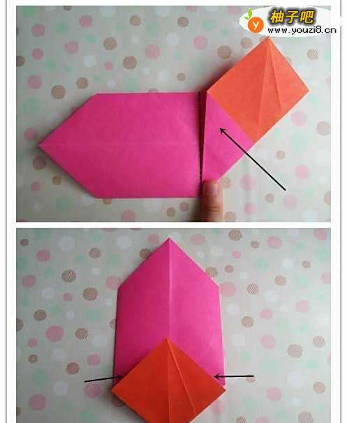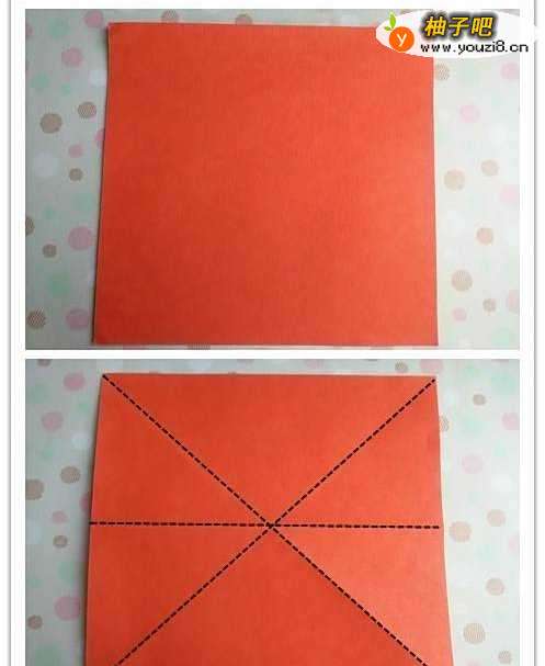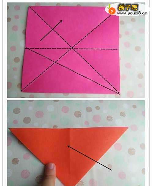 另取一张纸(红色在上为正面),重复步骤一的折法,两条折痕部分的网上折,折好后翻过来成为三角形。向内折入成为正方形。