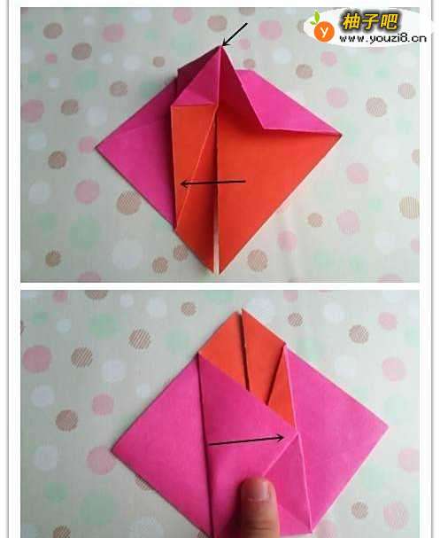 6上下两个直角沿水平向下向上折,翻到背面,上半部分左右两角挖中间折,折好后打开塞入类似千纸鹤折法。