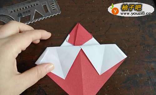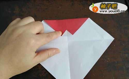 3把彩纸翻到另一面,把两侧的边向内折,再把上边的角向下折,如图所示。