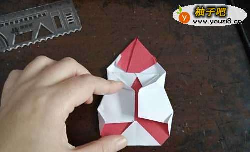 5把下边的角向上折,再把两侧的角向内折,如图一。然后翻到正面,如图二。