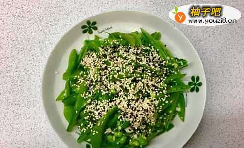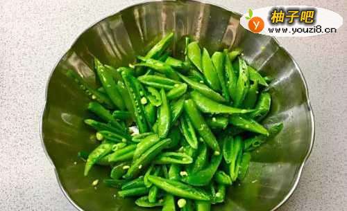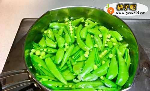 2水中加盐,荷兰豆入热水中氽烫后捞出