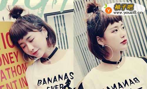 这本来是一款耳下的波波头,却在头顶扎出一个小丸子,加上二次元刘海的搭配,分分钟秒变精致小脸,且非常的活泼可爱。
