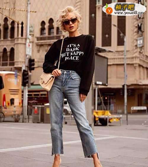 搭配三:浅灰色露脐卫衣+复古蓝紧身牛仔裤牛仔裤是我们日常搭配中必备的单品,牛仔裤的款式有很多,复古蓝紧身牛仔裤是今年很流行的裤子,能够修饰腿型,搭配一件浅灰色露脐卫衣,时尚、休闲又洋气。