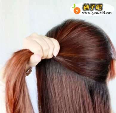 2将这部分头发用橡皮筋扎起来,注意看上图,马尾是不要全部抽出来的哦!