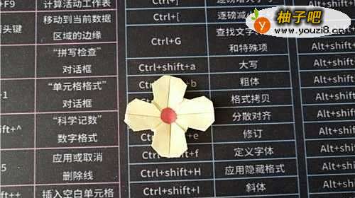 6四个花瓣都粘好后,最后再贴上一个红色的圆形在中间就可以了,图二是完成图。