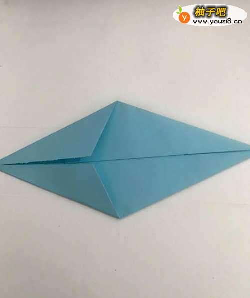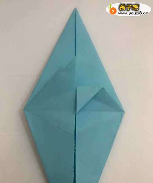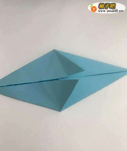 3第三步 上下两角都向中线折倒之后 再取开当中重叠的三角 然后捏折两个双边三角向右头折倒