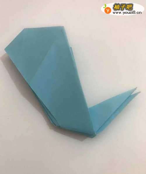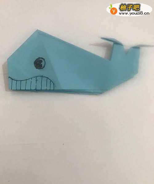 7第七步 回折好之后 再把它的尖角向下折叠一小段 再向两边平折出两个小角 然后用黑色水笔给小鲸鱼画上眼睛和嘴巴 再整理一下 一只可爱的小鲸鱼就折叠完成了