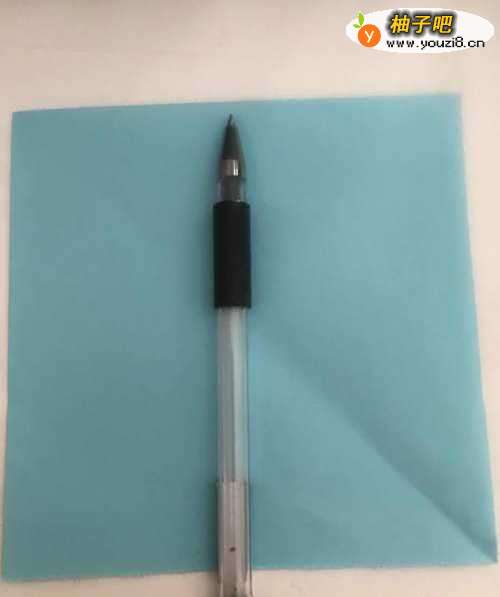 第一步 取一张边长为16厘米的正方形粉蓝色彩纸如图摆放 然后再把它从下向上对角折叠后取开 再把上下两个角都向中线折叠