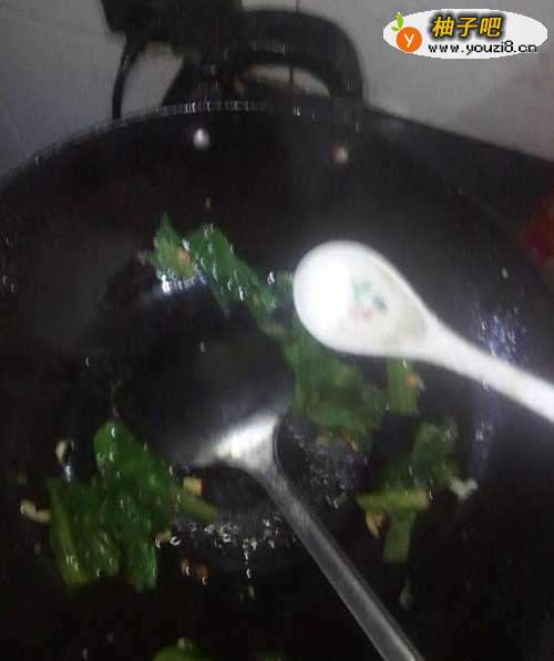 55、如图所示;第五步:大蒜炒几下就可以了,然后把火开到中火,对于不常做菜的温度高容易把菜炒焦,接着把切成段的苦青菜倒入锅里。