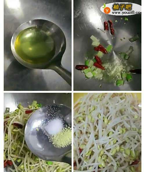 3起锅烧油,油热炒葱花、干辣椒,加入豆芽放盐、鸡精翻炒起锅备用。