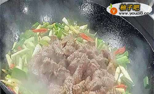 4加入炒过的牛肉丝,用少许米酒及酱油沿锅边呛锅,可制造香气。