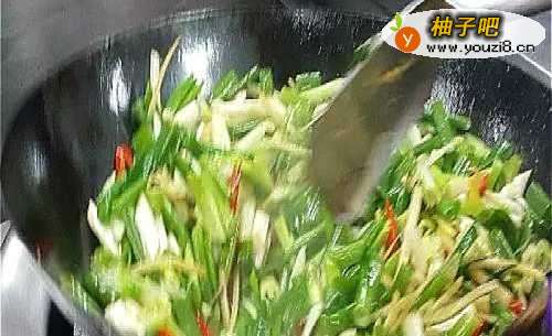 3利用锅内锅气,加入姜片、辣椒炒香,放入大量的葱段。