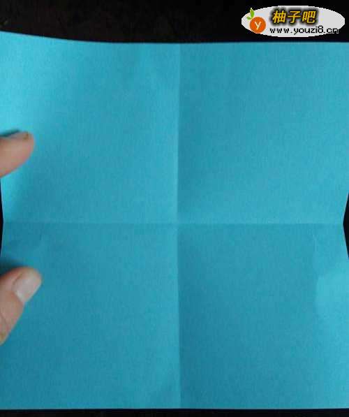 我们先把彩纸的两条中线分别对折后打开,翻过来。再把彩纸的两条对角线对折。如图。