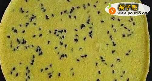 4拿出黑芝麻,在容器里面撒上一些黑芝麻,然后搅拌均匀,这样我们的面糊就做好了。