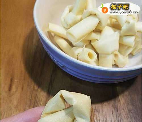 5加入花雕酒和百叶结。吃之前可以放入洗干净的小棠菜煮1-2分钟即可。