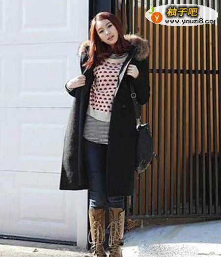 10乳白色羊毛大衣,精致简单的设计款式,复古圆领版型,穿在身上高雅动人。内搭黑色连衣裙,下穿白色裤袜,黑色过膝长靴,穿出与众不同的名媛气质。胖人一般脖子较短,切记最好不要穿高领,本人就悲剧过。。。