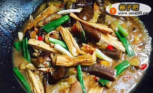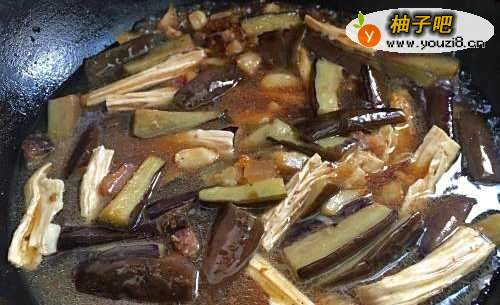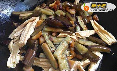 4紧接着将豆瓣酱倒进去煸炒一会,然后把炸好的茄子和腐竹倒进去翻炒,翻炒过程中可以将酱汁调好。