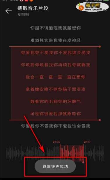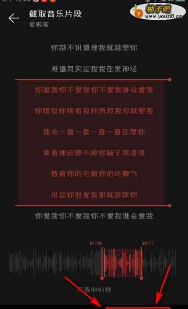 4进入截取音乐片段界面,点击左下角的视听铃声图标,上下拖动右侧两个小点,选择音乐片段。