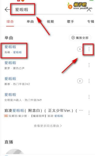 2界面切换,搜索框内输入歌名,在搜索结果中找到单曲,点击右侧的三个点图标。