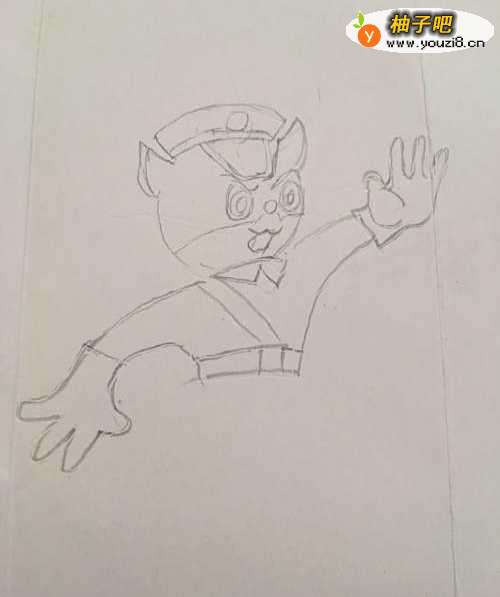 4第四步 再画上黑猫警长的上半身 和衣服 腰带 跨带 手套 扣子等等