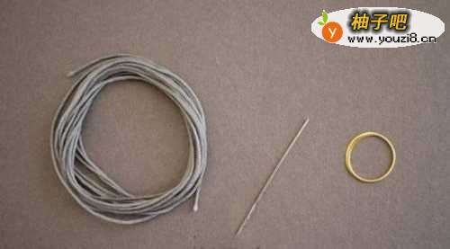 首先准备好我们所需要的东西,即编织绳和金属环,在这里我先挑了一个比较简单的小金属环。在金属环两端对称地将绳子固定好。
