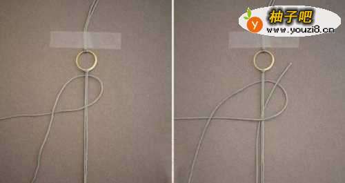 2将绳子固定好后,另取一根编织绳,在其中一端开始编织。另取的绳子从中间分为两股,将其中间点置于固定的绳子两端,左边的放置到右方,右边的放置到左方,按图中所示摆放上下位置,再收紧。相同的步骤重复。