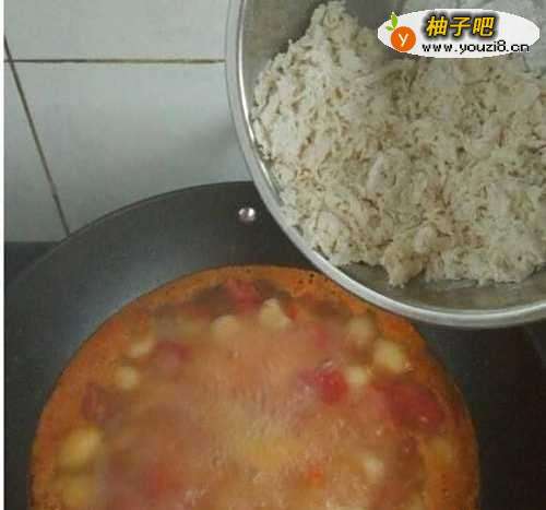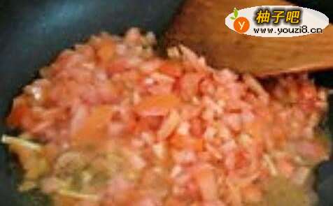 3锅中放油,放入花椒,蒜片,炒香;放入西红柿丁,炒出沙