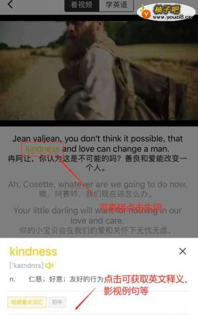 3在观看过程中,如果出现生词,可直接点击单词,即可获取相关解析。并可结合其他包含该单词的影视片段中,结合语境进行记忆。