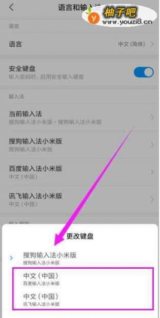 7这时,会向上弹出选项,你可以选择其他输入法了哦!比如你可以选择百度输入法小米版,还有讯飞输入法版,如图所示