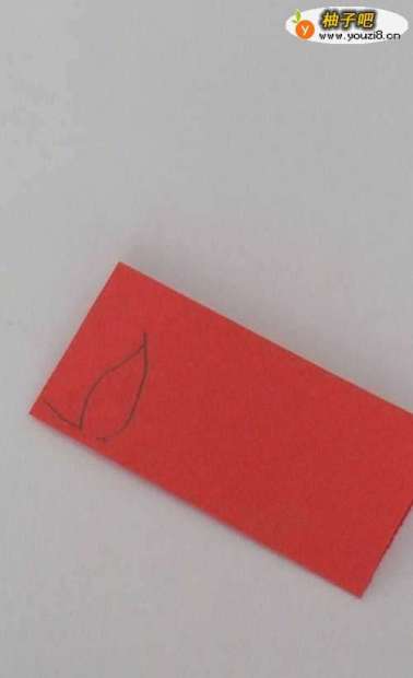 我们把正方形的彩纸从中间对折起来,然后压平,然后我们先在最上面的位置画上一片尖尖的叶子